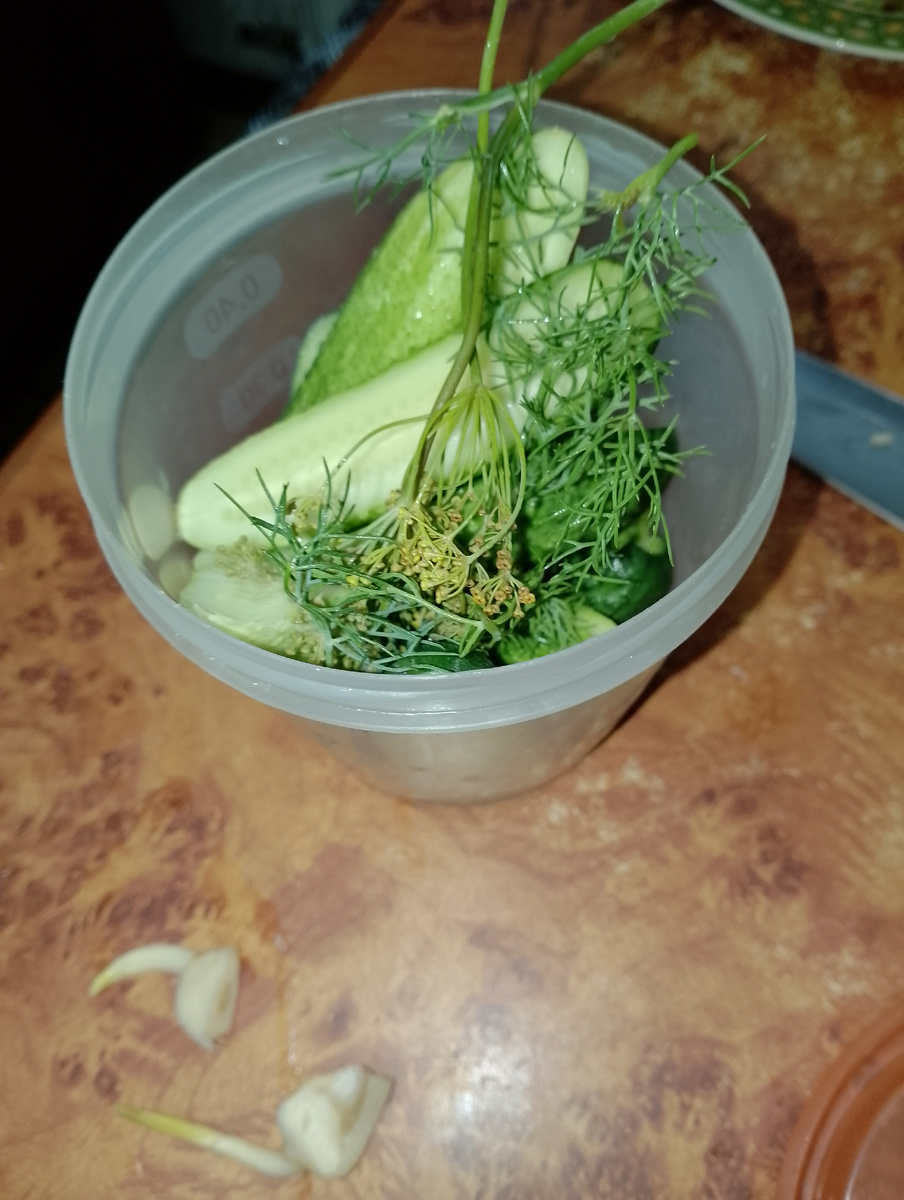 Для начала следует тщательно подготовить все ингредиенты. Огурцы аккуратно нарезаются дольками, а чеснок — на мелкие кусочки. Не стоит жалеть чеснока, поскольку его аромат придаст блюду насыщенный вкус. Укроп, как главный ингредиент, добавляется к огурцам, а затем все это щедро солится.