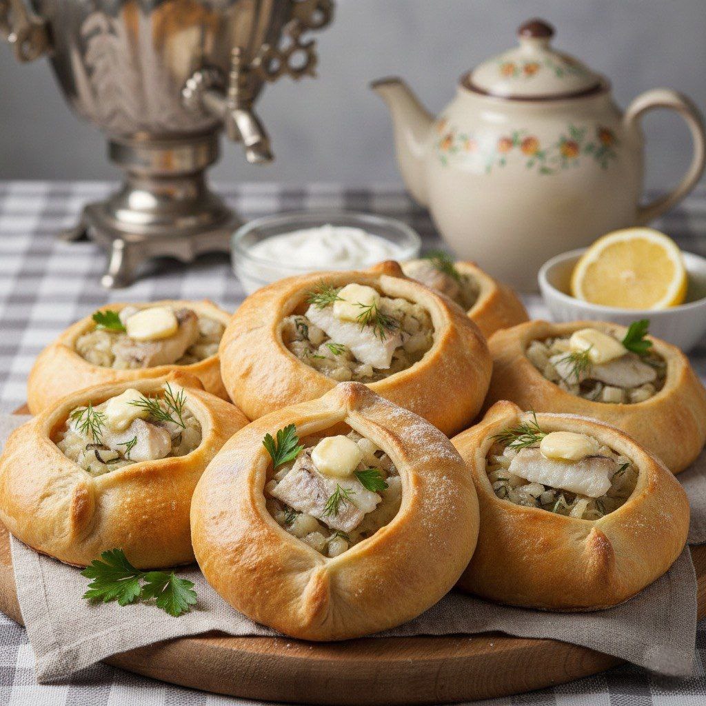 Расстегаи представляют собой классические русские пирожки с открытой верхней частью, разнообразие начинок которых восхищает. Они славятся своей нежной текстурой и утонченным вкусом, что делает их идеальной закуской.