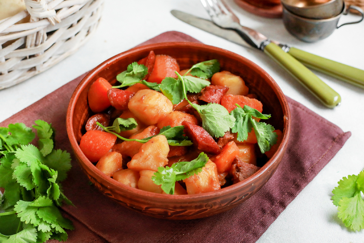На глубокой сковороде с добавлением столовой ложки растительного масла обжариваются нарезанные колбаски на среднем огне в течение нескольких минут, пока не подрумянятся. Затем к ним добавляется говядина, которая также требуется обжарить несколько минут, помешивая. Далее к мясу добавляют нарезанные лук, морковь, картофель, томатную пасту, гвоздику и зиру, обжаривая ещё 2-3 минуты.