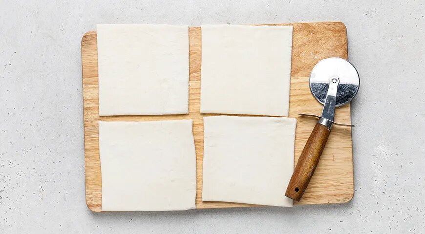 - Разморозить слоеное тесто, следуя рекомендациям на упаковке.