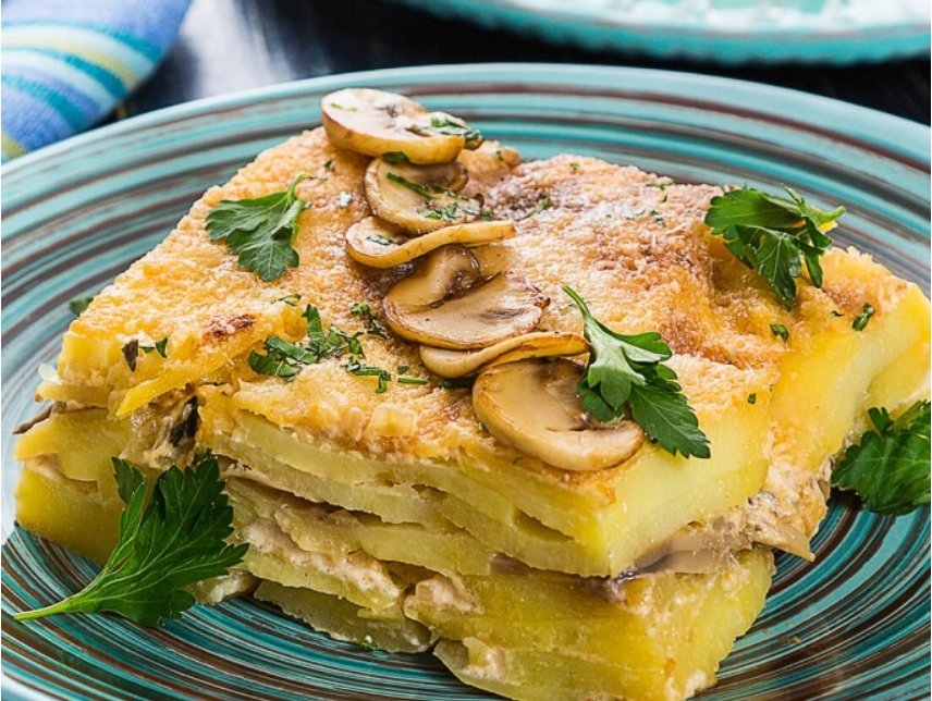 Шаг 5: Смазать форму для запекания оливковым маслом. Выложить в неё половину картофельных кружков, затем слой обжаренных грибов с луком, сверху – оставшиеся картофельные кружки. Полить всё сливочным соусом с белыми грибами и отправить в духовку на 30 минут.