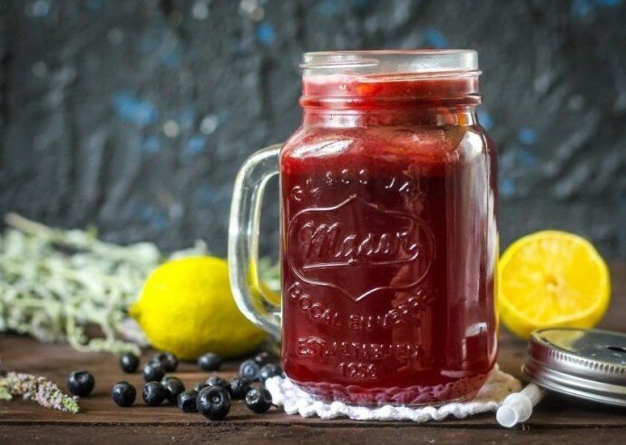 7. После охлаждения разлить черничный лимонад по чашкам, стаканам или коктейльным банкам, добавить лед и насладиться освежающим вкусом.