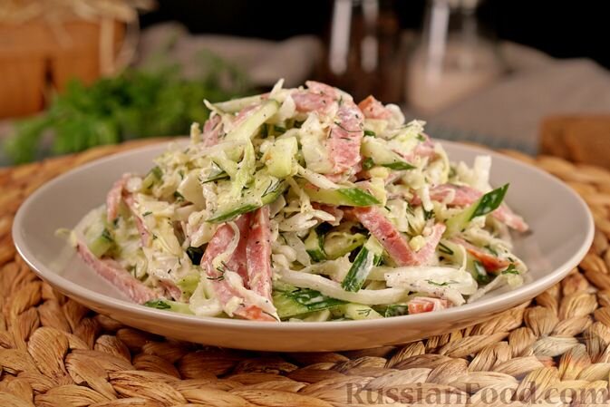 Начать стоит с салата из капусты с огурцами и колбасой. Комбинация свежей капусты и хрустящих огурцов в сочетании с копченой колбасой выводит блюдо на пикантный уровень. Этот салат подается с легкой майонезной заправкой, а уксус и зелень придают ему свежесть.