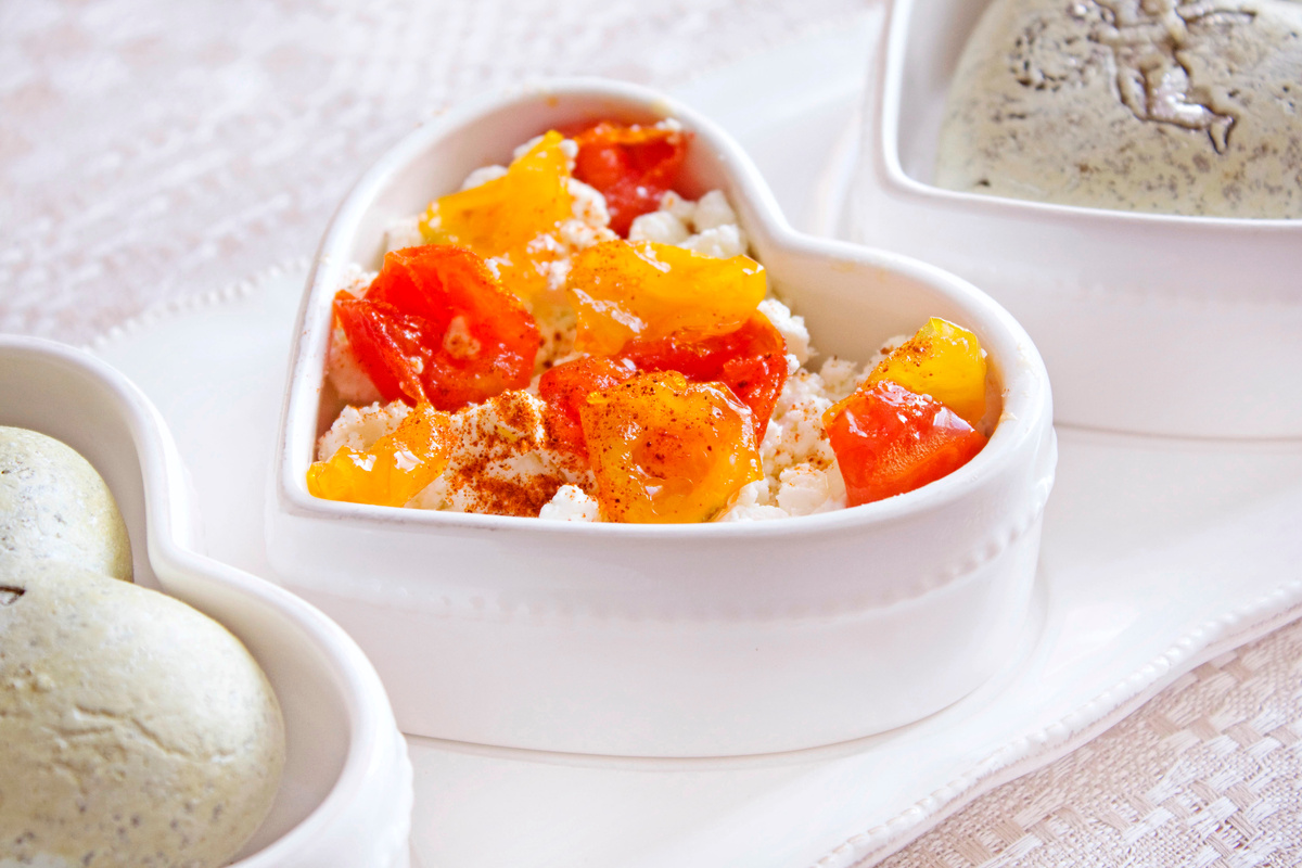 - Приготовление: Промойте и нарежьте томаты, смешайте с медом и имбирем, томите на слабом огне 50 минут. Охладите, подавайте с сыром и розовым перцем.