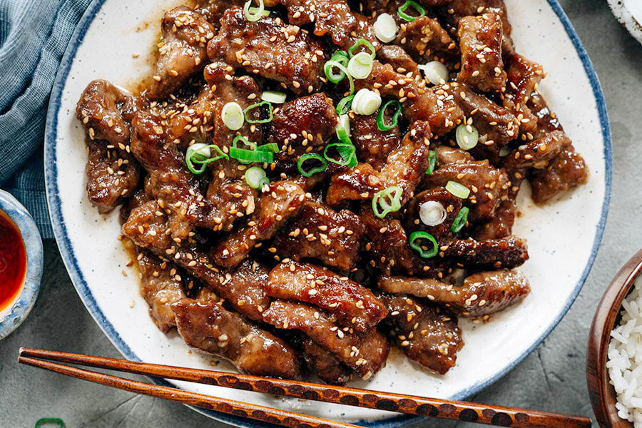 Говядину нарезать тонкими ломтиками толщиной 3–4 мм, расположив их поперек волокон.Переложить нарезанные куски в миску, добавить шаосинское вино, молотый черный перец и соль. Перемешать и добавить кукурузный крахмал, снова тщательно перемешать. Оставить на 15 минут для маринования.Смешать все ингредиенты для соуса в отдельной миске.Разогреть растительное масло в глубокой сковороде на среднем огне. Выложить говядину в один слой и обжаривать до золотистой корочки около 1 минуты, перевернуть и повторить. Если сковорода перегружена, жарить порциями.Убавить огонь до ниже среднего и достать говядину со сковороды, положив её на тарелку.Перемешать соус (возможно, крахмал осел) и вылить его в сковороду, довести до кипения на среднем огне, продолжая помешивать, пока соус не загустеет.Выключить огонь и вернуть кусочки говядины в сковороду, тщательно перемешать для равномерного покрытия соусом. Посыпать семенами кунжута. Блюдо готово к подаче.Приятного аппетита!