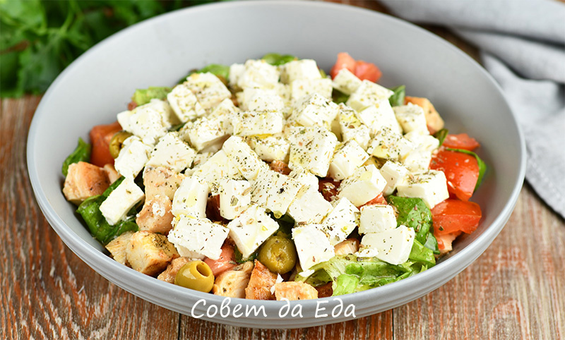 - Ингредиенты: 250 г куриного филе, 30 г листьев салата, 250 г помидоров, 1/2 банки оливок, 3 ст. л. растительного масла, 1 ч. л. горчицы, сок лимона, зубчик чеснока, сушеные травы, 170 г сыра брынза.
