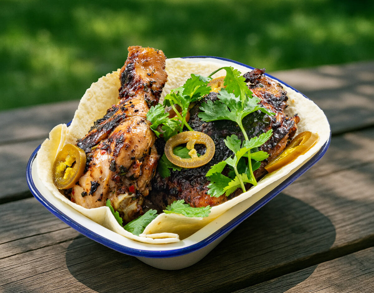 Запаситесь всеми необходимыми ингредиентами.Мелко нарежьте кинзу, петрушку и зеленый лук.Измельчите свежие перцы чили и чеснок, а имбирь натрите на мелкой терке.В ступке аккуратно растолките душистый и черный перец вместе с хлопьями чили.Добавьте сахар и мед в пряную смесь.Смешайте имбирь с толчеными специями, чесноком и чили, тщательно все перемешивая и приправляя солью.Внесите нарезанную зелень, оливковое масло и сок лайма, вновь перемешайте до однородности.Дайте получившемуся маринаду окутать курицу, втирая смесь руками. Отправьте в холодильник на 2-3 часа, а лучше – на всю ночь.Поместите замаринованную курицу на решетку с кожей вниз, выставив зону для умеренного огня. Для аромата можно слегка сбрызнуть угли пивом. Жарьте в течение 40-50 минут, часто переворачивая, до золотистого цвета. Чтобы проверить готовность, надрежьте мясо: выделившийся сок должен быть прозрачным.Подавайте курицу с лепешками и пикантным перцем халапеньо, чтобы усилить впечатление от блюда.
