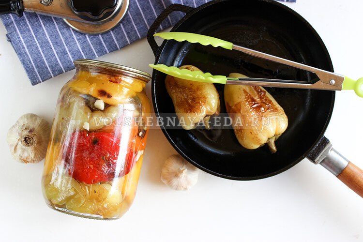 Обжаренные перцы помещаются в подготовленные банки, не стоит бояться их прокалывать вилкой — это поможет удалить воздух и обеспечить равномерное распределение маринада. Наполняя банки, на половине следует добавить нарезанный чеснок, затем заполнить до конца, добавив остатки зубчика на верх.
