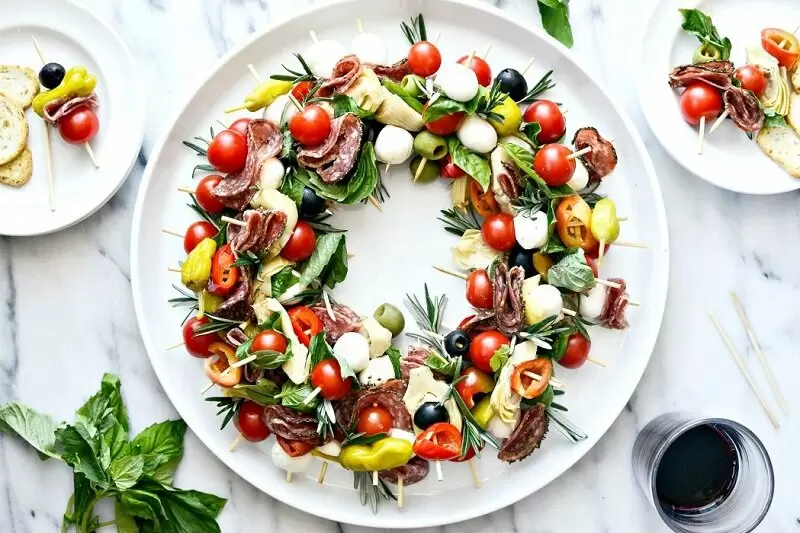 Шпажки располагаются на блюде по кругу, формируя венок. Для украшения закуску можно полить бальзамическим соусом и добавить итальянскую заправку. Завершите оформление веточками розмарина и укропа — они добавят свежести и праздничности. Блюдо готово к подаче!