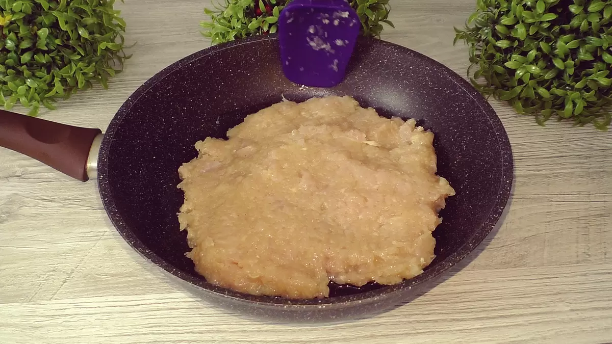 Сковороду диаметром 26 см смазывают растительным маслом и аккуратно выкладывают массу, формируя корж. Накрывают крышкой и готовят на высоком огне в течение 1 минуты, после чего уменьшают нагрев и оставляют на среднем огне ещё 12-15 минут.