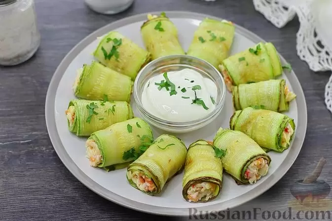 - Кабачки с крабовыми палочками: Нежная закуска, которая прекрасно впишется в праздничный стол или станет полезным вариантом для перекуса.