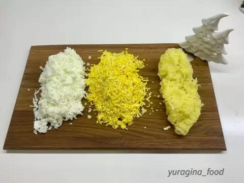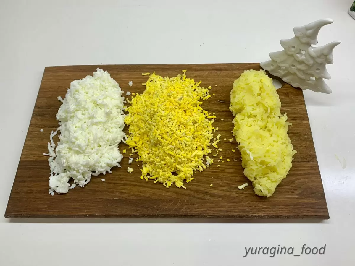 Начните с того, чтобы поместить сливочное масло в морозильник. Далее нужно сварить яйца вкрутую и отварить картофель в мундире. После этого отделите желтки от белков и натрите их на мелкой тёрке, сделав то же самое с картофелем.