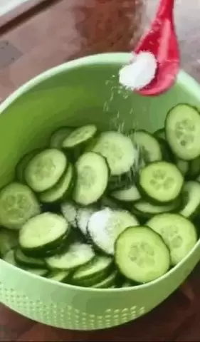 1. Для начала огурцы следует нарезать тонкими кружками, затем поместить их в миску, добавить немного соли и оставить на 15 минут, чтобы они пустили сок. Это действие способствует раскрытию аромата.
