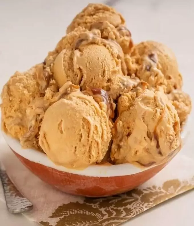Взбивание и заморозка: После охлаждения взбить смесь в мороженице 25-30 минут. Переложить мороженое в контейнер, полить оставшейся карамелью и перемешать ножом для создания мраморного эффекта. Убрать в морозильник минимум на 8 часов.