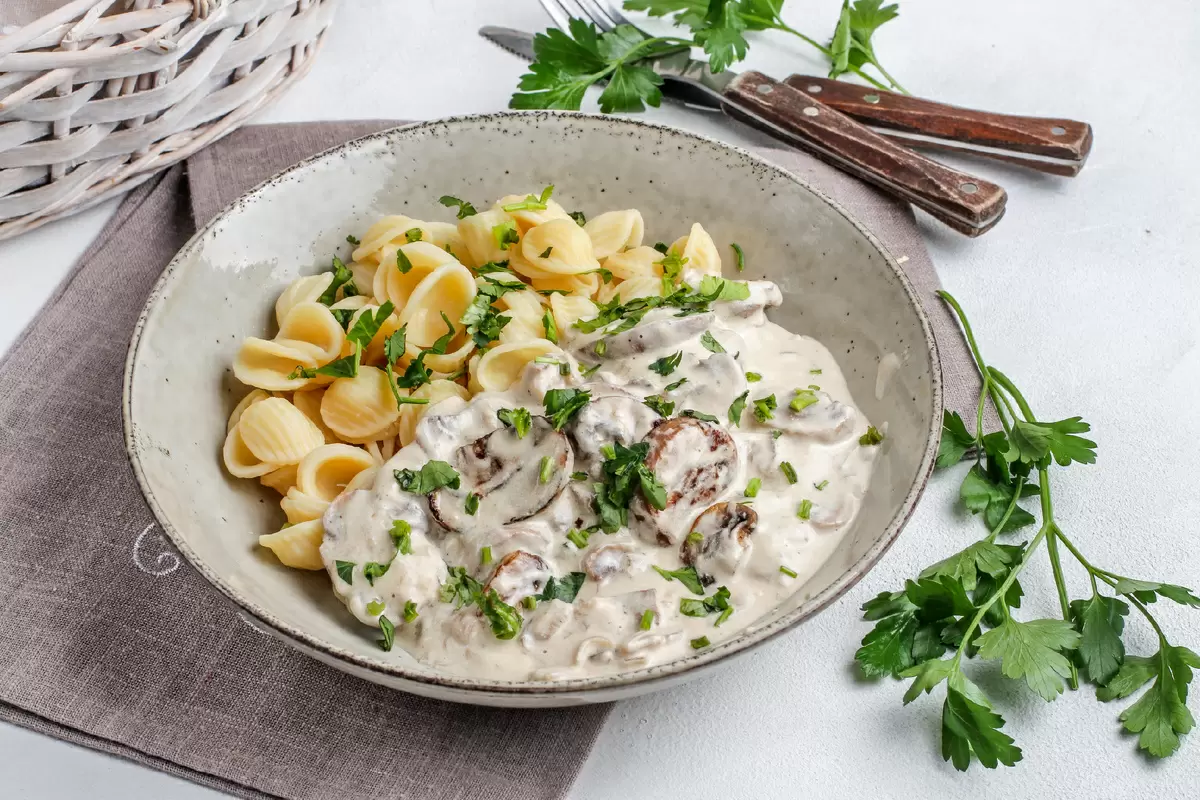 Шаг третий: создание соуса. В самом конце введите сливки, добавьте дижонскую горчицу, подсолите по вкусу и готовьте в течение 2-3 минут. Уберите веточки тимьяна и подавайте грибной строганов, аккуратно перемешав с орекьетте.