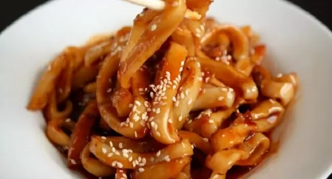 Блюдо подается горячим, его можно украсить кунжутом или зеленью. Остуженные кальмары станут отличной холодной закуской, которая приятно удивит ваших гостей!