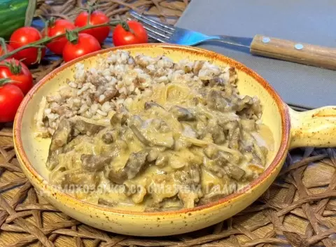 Опустите кусочки печени на разогретую сковороду к луку и быстро обжарьте их на сильном огне в течение 1-2 минут, постоянно помешивая. В емкость с сметаной добавьте немного воды, тщательно перемешайте и влейте в сковороду. Смесь доводится до кипения, а затем накрывается крышкой и тушится на тихом огне в течение 15-20 минут. Для особого вкуса по желанию можно добавить любимые специи — к примеру, мускатный орех.