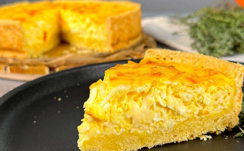 В основе пирога находится легкое тесто с рассыпчатой текстурой, а внутри — сочная сырная начинка. Основные ингредиенты: