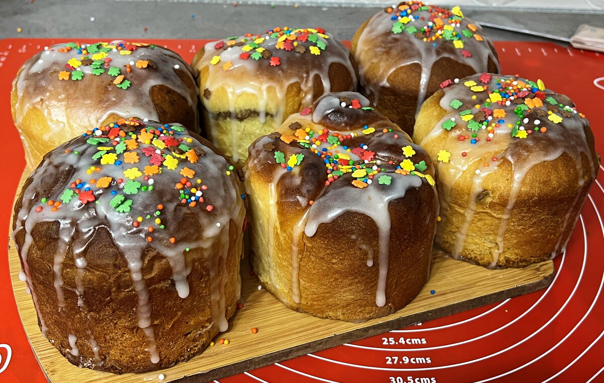 После этого куличи ставят в разогретую до 180 градусов духовку и выпекают в течение 40-45 минут. Готовые изделия покрывают сахарной глазурью и украшают цветными сахарными кондитерскими украшениями. Вот такой праздничный кулич получается не только красивым, но и невероятно вкусным!