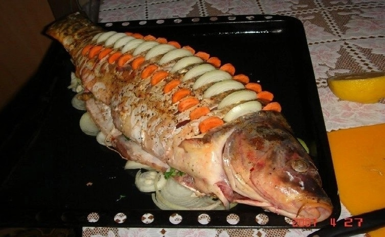 Для ароматности оставшееся зелень, кусочки лука, моркови и лимона помещаем в голову рыбы. Запекаем карпа в духовке в течение одного часа и двадцати минут. После этого великолепное блюдо готово к подаче. Не забудьте оставить себе кусочек головы, чтобы насладиться её особым вкусом!