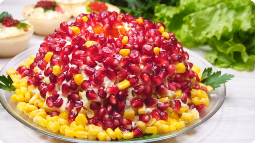 Затем накрыть миску плоским блюдом и аккуратно перевернуть. Снять пленку и смазать верх и бока майонезом. Обильно посыпать зернами граната и добавить кукурузу для яркости. Дать настояться в холодильнике 1-2 часа для лучшего вкуса. Приятного аппетита!