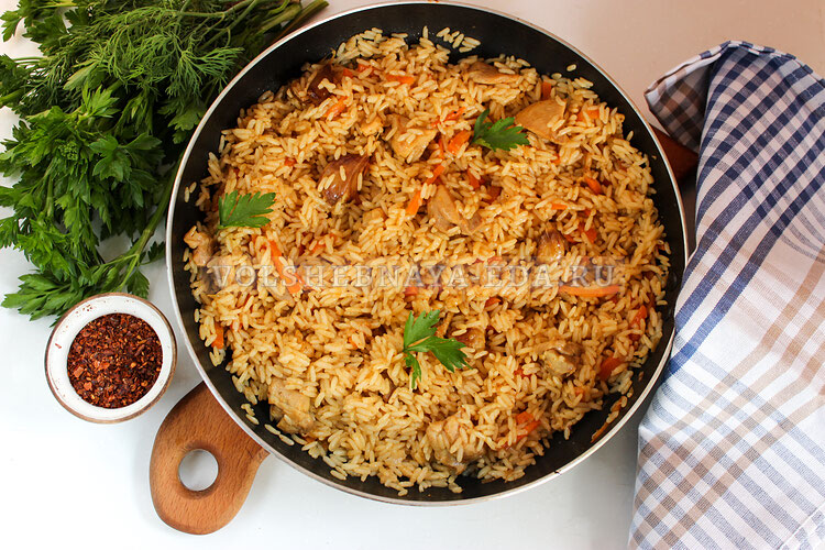 Добавляя горячую воду, она должна полностью покрыть курицу с овощами. Сковороду накрывают крышкой и тушат 20 минут. В то же время рис замачивается и тщательно промывается до прозрачной воды.