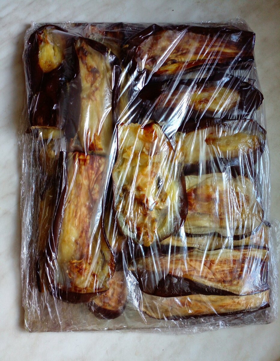 После того, как они прекрасно зарумянились, необходимо достать их из духовки и дать остыть на столе. Для удобства заморозки, разделочную доску стоит покрыть пищевой пленкой и аккуратно разложить остывшие баклажаны, накрывая каждый слой пленкой — это предотвратит прилипания.