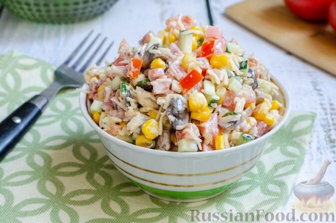 Овощной салат с колбасой, жареными шампиньонами и сыром станет прекрасным дополнением к любому столу. Сочетание свежих огурцов, мягких отварных яиц и ароматной копчёной курицы подарит отменный вкус. Этот слоёный салат отлично подойдёт для пиршеств и удивит всех своим великолепным оформлением.