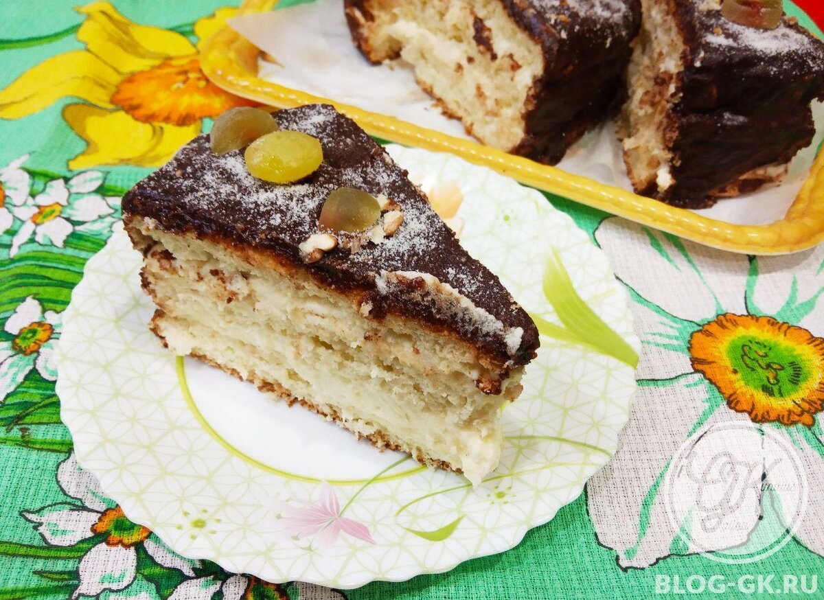 7. Разрежьте остывший бисквит на три коржа, промажьте два из них заварным кремом, а верхний – глазурью, приготовленной из сахара, какао и молока, доведенных до загустения с добавлением масла.