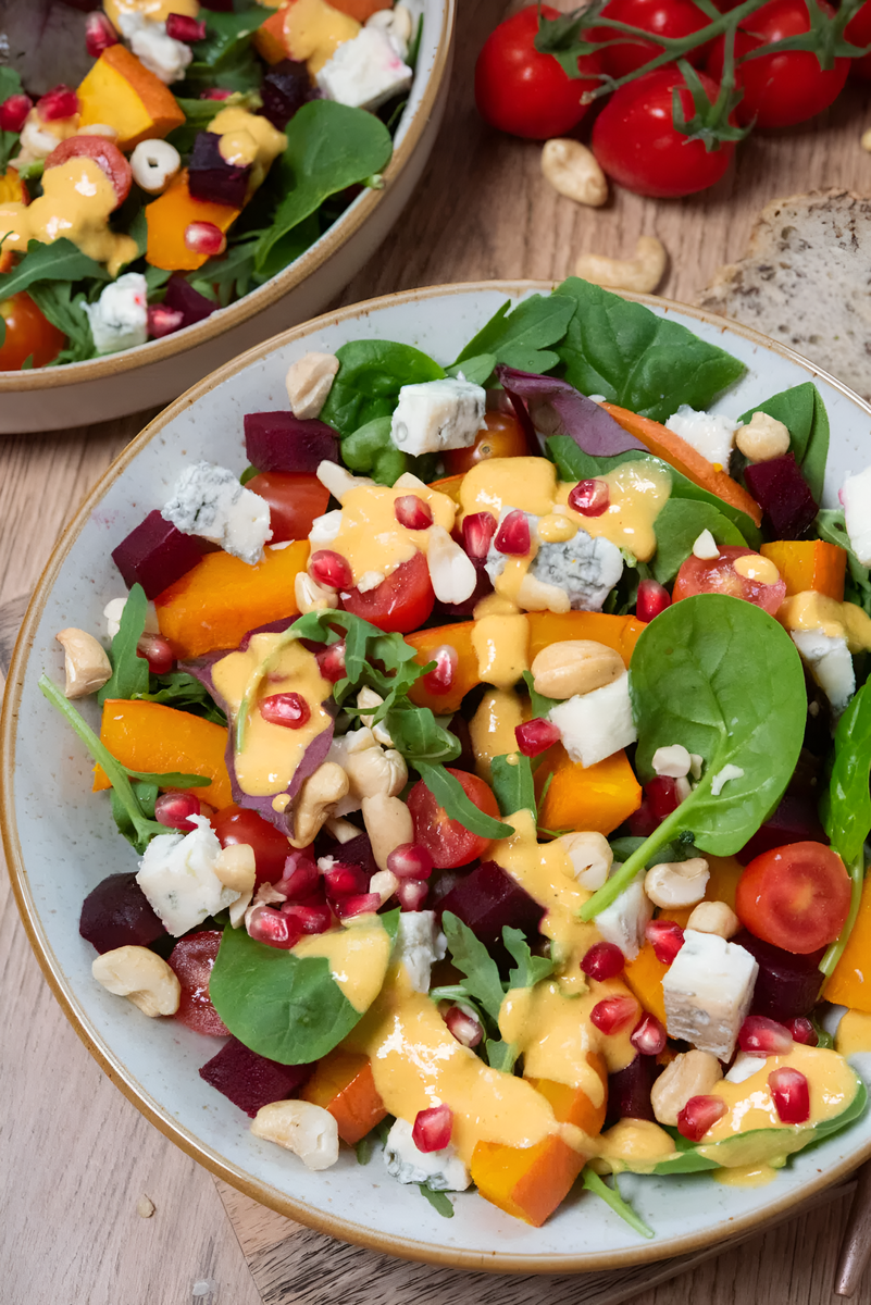 В готовый салат добавьте кубики горгонзолы и орехи, сверху посыпьте зернами граната, а затем полейте горчично-ореховым соусом. Салат готов к подаче!