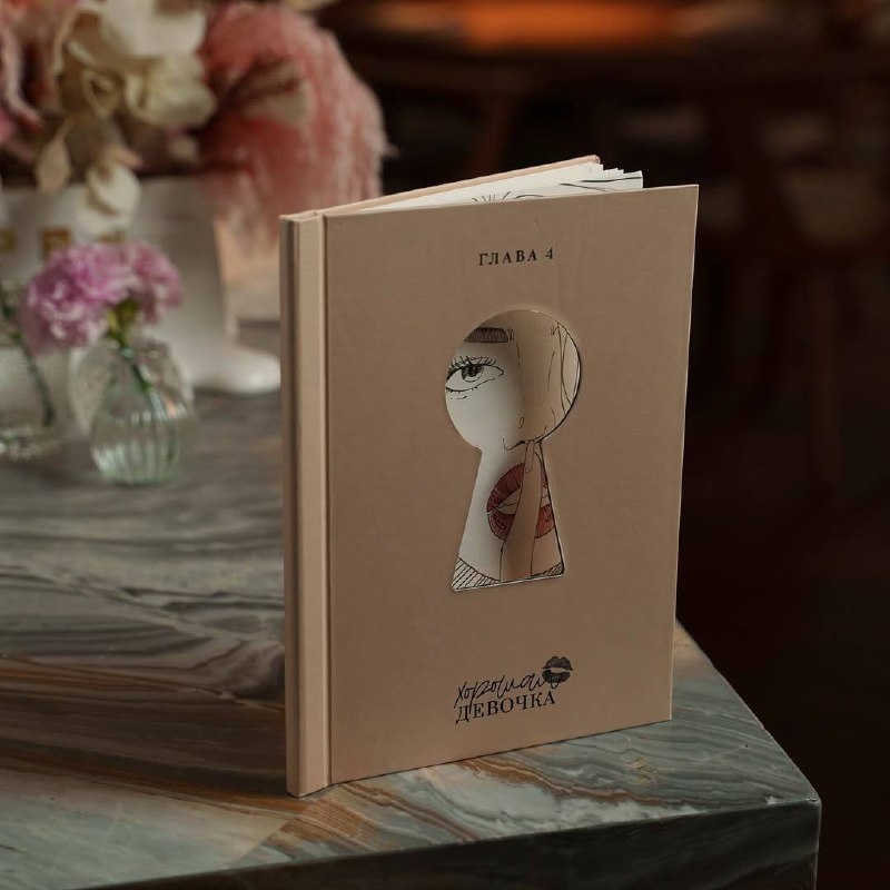 Стильно оформленные меню, выполненные в нежных розово-персиковых тонах, содержат оригинальные детали, такие как прорезь в виде щели для ключа. Это позволяет заглянуть внутрь и увидеть лицо девушки, что создает уникальную атмосферу.