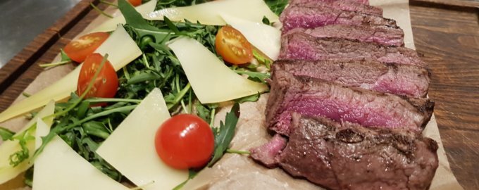 Пока мясо остывает, промойте рукколу и обсушите её. Помидоры разрежьте пополам и слегка посолите. Пармезан можно нарезать слайсами или натереть на крупной терке.