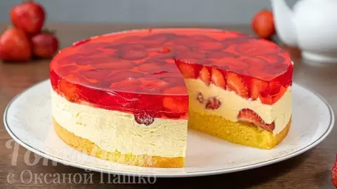 Теперь можно собирать торт: бисквит пропитайте сахарным сиропом, добавьте слой крема и свежую клубнику, затем снова закройте кремом. После этого поместите торт в холодильник для застывания желе. Этот десерт станет отличным завершением любого летнего обеда.