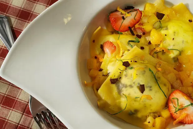 Для теста сделайте горку из муки двух видов, в центре сделайте углубление. Выложите туда белки и желтки, добавьте оливковое масло и немного соли. Замесите тесто и дайте ему охладиться в холодильнике на час. После этого раскатайте его в тонкий лист толщиной 0,8 мм.Начинку готовят, смешивая рикотту, сахарную пудру и немного дробленого горького шоколада, оставив немного для украшения.На одну половину тестового листа выкладывайте по столовой ложке начинки. Смажьте края водой, накройте второй половиной и тщательно прижмите, чтобы избавиться от воздуха. Вырежьте равиоли с помощью специального штампа или просто ножом.Натрите немного апельсиновой цедры и выжмите сок в сотейник. Уваривайте на сильном огне до получения соуса, не дольше 5 минут.Фрукты (ананас, груши и манго) нарежьте кубиками, клубнику — более крупными кусками. Добавьте их в соус и готовьте минуту, перемешивая.Отварите равиоли всего три минуты. Готовые равиоли перенесите в сотейник с фруктами и немного прогрейте.Подавайте на тарелках, украсив клубникой, мятой, цедрой и шоколадом.
