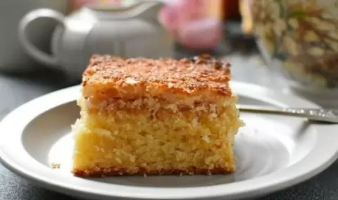 Добавьте горячее молоко с маслом, тщательно перемешивая до получения однородного теста, затем вылейте его в подготовленную форму и поставьте выпекаться на 20 минут.