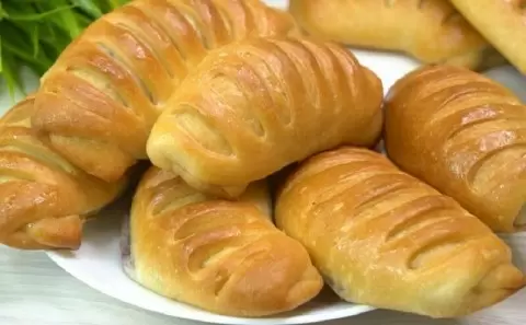 Когда тесто поднялось, его следует разделить на порции. Тесто раскатывается в тонкие лепешки, на которые помещается начинка. Затем края теста загибаются, а сверху можно сделать несколько надрезов. Заготовка выкладывается на противень, застеленный пергаментом. Выпекаются пирожки при температуре 180 градусов в течение 25 минут.