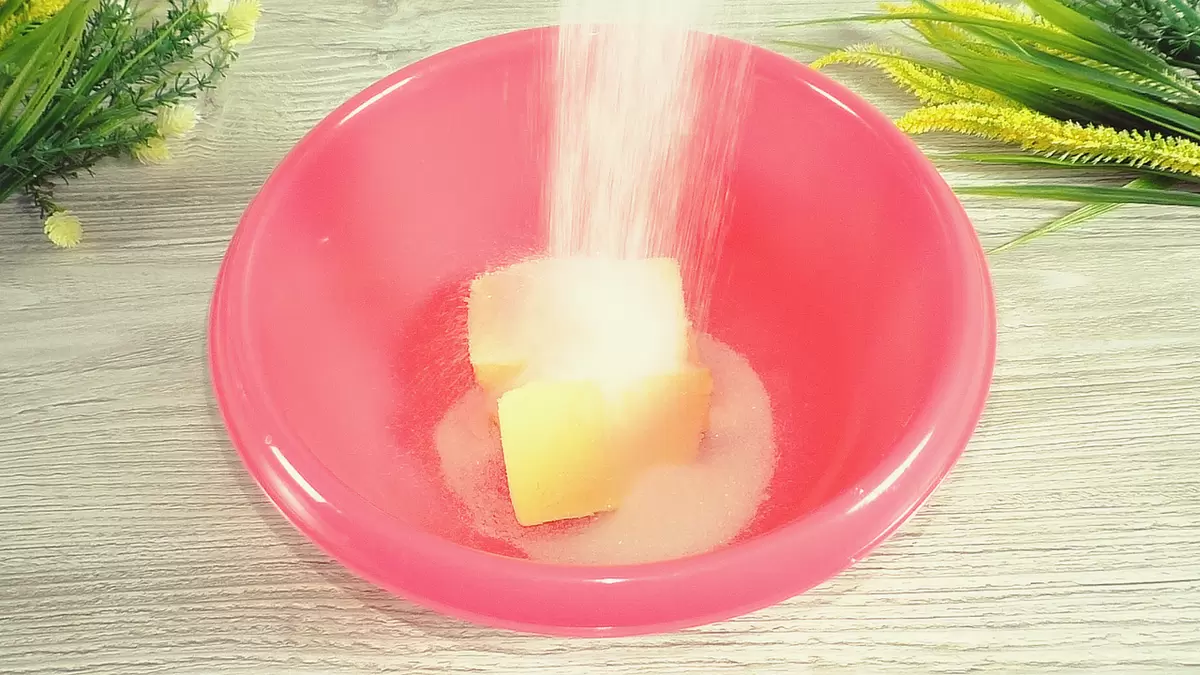 1. В миске с мягким сливочным маслом тщательно растереть сахар до получения однородной массы.