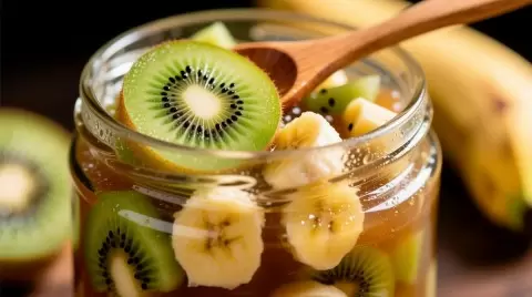 Этот джем готовится очень быстро и просто, не требуя умения. Подготовка фруктов начинается с того, что киви очищают и нарезают на кубики. Бананы также очищают и нарезают кружочками. После этого все нарезанные фрукты помещают в кастрюлю, посыпают сахаром и оставляют на 20-30 минут. Это позволит фруктам выделить сок и ускорить процесс растворения сахара.
