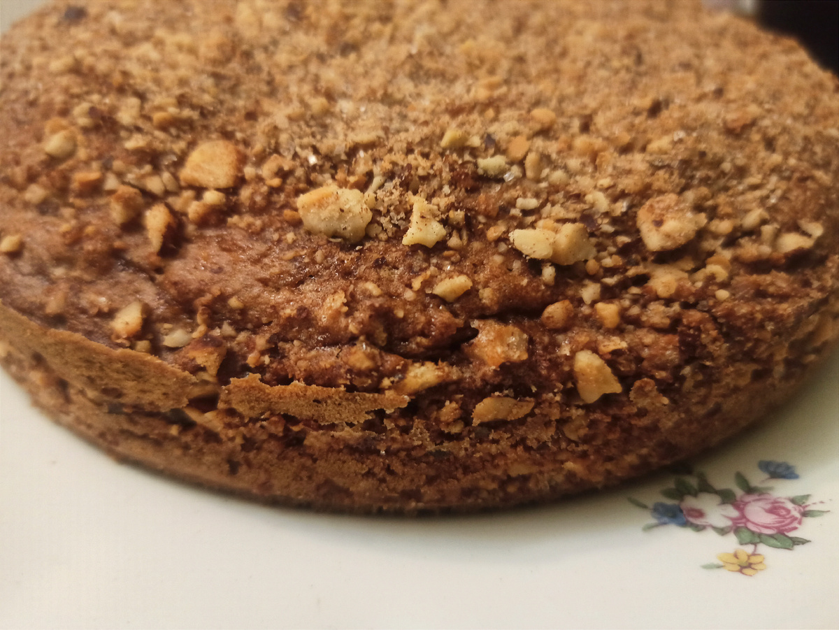 Форму для выпекания стоит смазать маслом и присыпать мукой (в силиконовые формы масло класть не обязательно). На дно формы следует насыпать немного ореховой крошки, затем выложить половину теста, снова посыпать крошкой, и завершить оставшимся тестом и крошкой сверху.