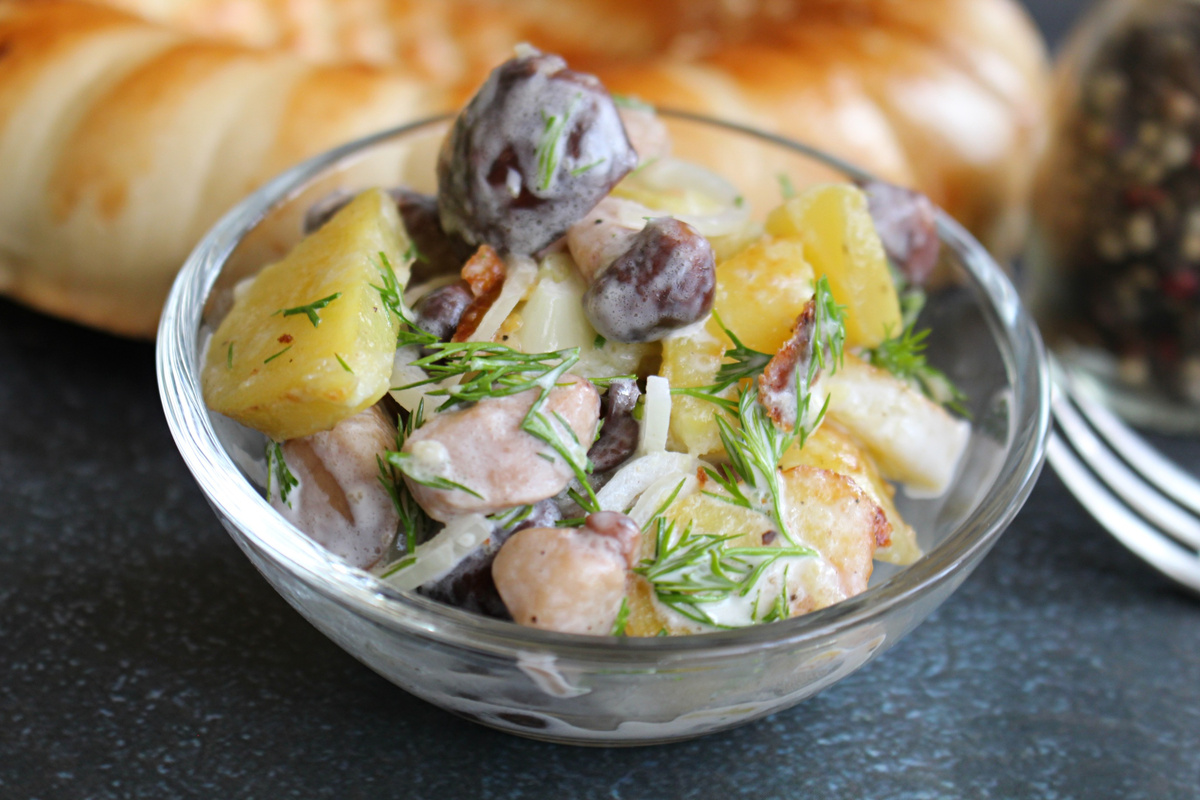 Картофельный салат с белыми грибами — это не просто закуска. Этот блюдо можно смело подать на обед или ужин. Оно не только сытное, но и насыщенное, с удивительным ароматом. Готовить его очень просто, а вот ингредиенты могут варьироваться по желанию.