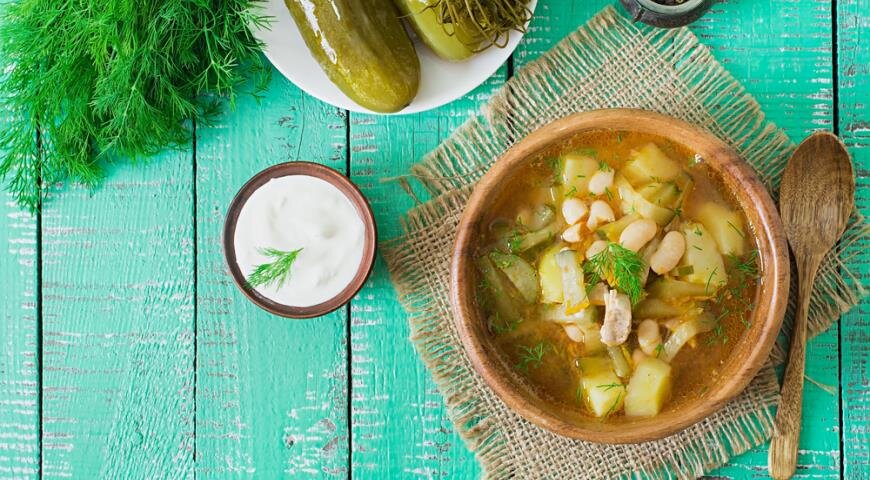 - Когда бульон готов, добавьте соленые огурцы и зелень по вкусу.