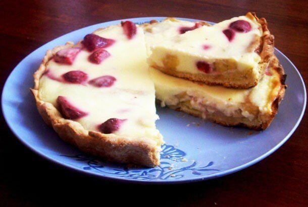 Когда тесто слегка пропечется, в него укладываются нарезанные фрукты и ягоды, заливаются сметанной смесью и пирог выпекается еще 20-25 минут или до полной готовности, обеспечивая густую начинку.