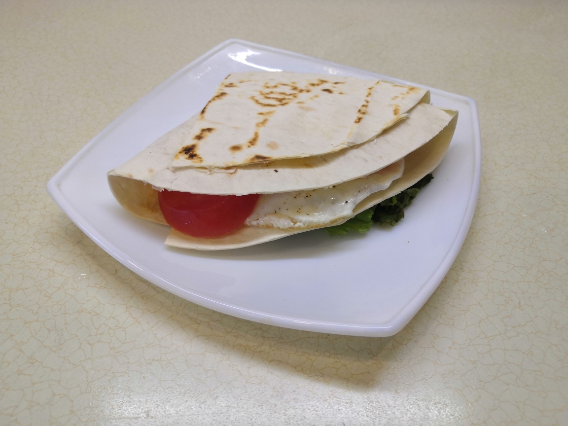Для этого рецепта требуется круглый лаваш. Его можно легко вырезать с помощью тарелки. Яйцо стоит пожарить на медленном огне под крышкой. Половину помидора нарезать кружочками, а листья салата предварительно промыть и подсушить. На лаваше сделать один разрез от края до центра.