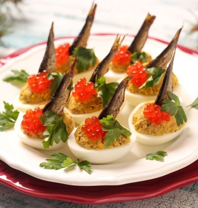 Теперь пришло время наполнить белки начинкой. Эстетичности блюду добавит укладка зерен красной икры и сохраненных хвостиков шпрот. Завершает процесс оформление закуски веточками свежей петрушки.