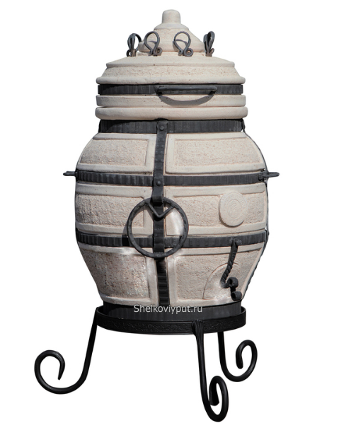 Изготовленный из шамотной глины и укреплённый стальными полосами, тандыр может быть использован не только на даче, но и на различных выездных мероприятиях, благодаря своему стилю и малому весу.